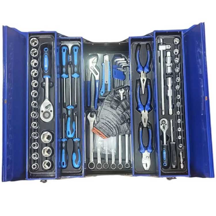• **جعبه ابزار فلزی (Tool Chest):** جعبه فلزی آبی رنگ با قابلیت باز شدن دو طرفه (تاشو)، ابزارها را در سینی‌های منظم نگه می‌دارد و دوام بسیار بالایی دارد.