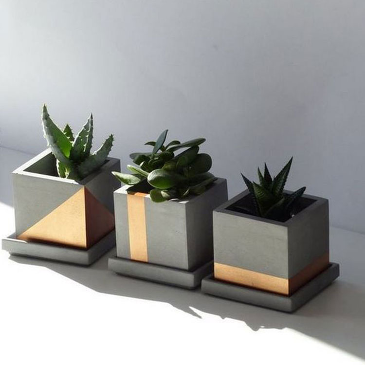 ست بتنی مدل CS_13 | مجموعه سه‌تایی گلدان مکعبی با تزیینات مسی/طلایی – گیفتولند
