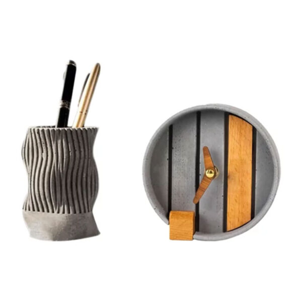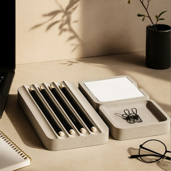 ست بتنی CS_18. ارگانایزر دو طبقه (جاقلمی و گلدان) با طراحی پلکانی و هندسی. ایدهآل برای میز کار مینیمال و هدیه تبلیغاتی با تم معماری.