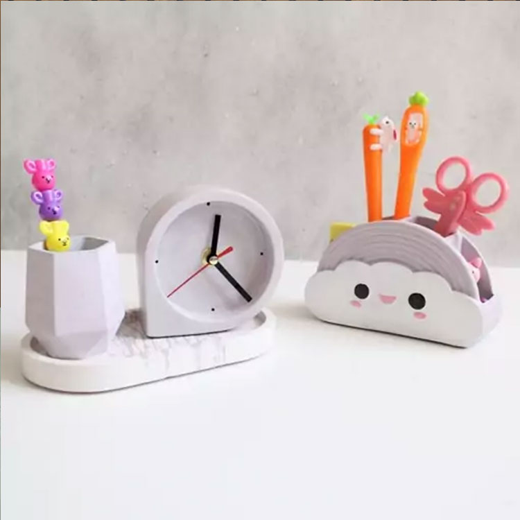ست بتنی CS_32. ست سهتکه رومیزی با تم فانتزی و شاد (شامل طرح ابر). شامل ساعت، گلدان/جاقلمی و ارگانایزر. ایدهآل برای برندهای کودک و آموزشی.