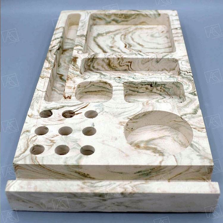 مدل CS\_33، اوج تلفیق **عملکردگرایی و زیباییشناسی لوکس** در محصولات بتنی است. این ست نه یک مجموعه از قطعات، بلکه یک **سینی ارگانایزر یکپارچه (Monolithic)** با حفرههای متعدد است که هر شیئی را در جایگاه خود قرار میدهد. اصلیترین وجه تمایز CS\_33، پرداخت بتنی آن است که با رگههای رنگی (مانند طرح مرمر یا سنگ طبیعی) تزئین شده و آن را به یک محصول بسیار **نفیس، گرانبها و چشمنواز** تبدیل میکند. این سینی جامع، فضای کافی برای موبایل، تبلت، قلمها، فنجان و اکسسوریهای ریز را فراهم میکند و انتخابی استثنایی برای هدیه به **مدیران ارشد، شرکتهای املاک لوکس و برندهای جواهرات** است.
