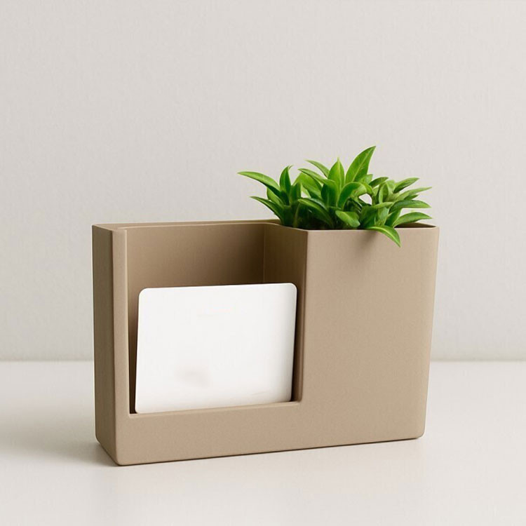 مدل CS\_37 نمادی از **مینیمالیسم عملکردگرا** در طراحی رومیزی است. این ارگانایزر در یک بدنه مکعب مستطیل یکپارچه، دو نیاز اساسی میز کار را پوشش میدهد: **مدیریت کارتها و اسناد** در یک محفظه افقی، و **افزودن عنصری از حیات** (گلدان کوچک) یا سازماندهی قلمها در محفظه عمودی. CS\_37 با خطوط زاویهدار تمیز، گوشههای راست و یک پرداخت بتنی فوقالعاده صاف و مات، به یک قطعه دکوراتیو لوکس تبدیل شده است. انتخاب رنگ **بژ/قهوهای روشن** (به جای خاکستری سنتی) این مدل را از سایر محصولات متمایز کرده و آن را به گزینهای عالی برای میزهای مدیریتی با دکوراسیون گرم تبدیل میکند.