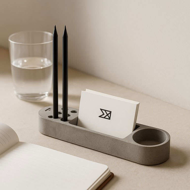 مدل CS\_49 نمادی از **مینیمالیسم عملکردی** است. این ارگانایزر بتنی افقی، سه عنصر ضروری و پرکاربرد میز کار را در یک قالب زیبا و یکپارچه ترکیب کرده است. با طراحی ساده اما هوشمندانه، این مدل نه تنها به نظم میز کار کمک میکند، بلکه به دلیل ترکیب **جاقلمی، جاکارتی و یک سینی کوچک**، انتخابی بسیار عملی و متمرکز برای هدایای تبلیغاتی در رویدادها، نمایشگاهها و کنفرانسها محسوب میشود. وزن و استحکام بتن، این ابزار را به یک قطعه دائمی و تأثیرگذار بر روی هر میز کار تبدیل میکند.