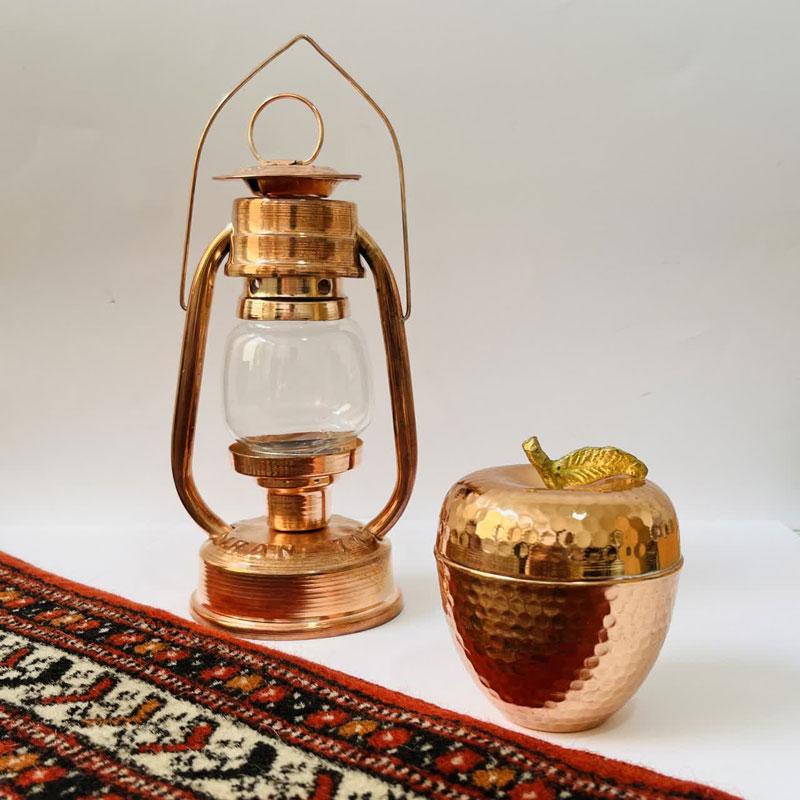 ظرف مسی طرح سیب با بافت چکشی، نماد سلامتی و شادابی در فرهنگ ایرانی است. این ظرف میتواند در یلدا محتوی باسلوق و شیرینی، و در نوروز محتوی سیب یا سنجد در سفره هفتسین باشد. ترکیب رنگ طلایی برگ با مس براق، جذابیت خاصی به آن بخشیده است.
