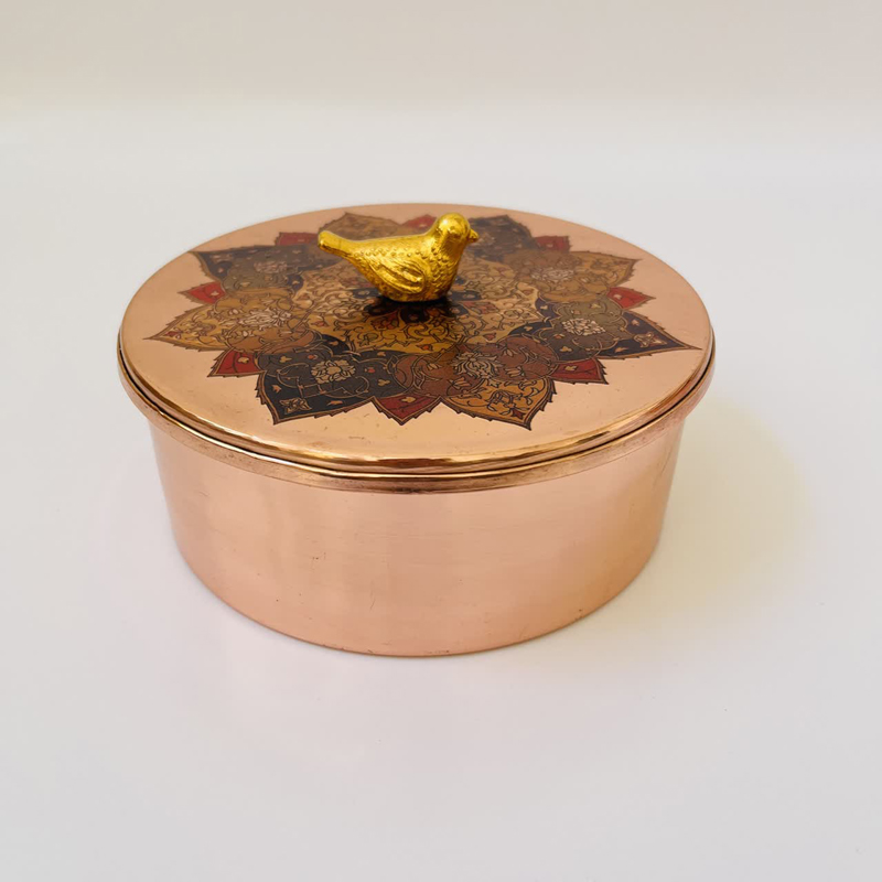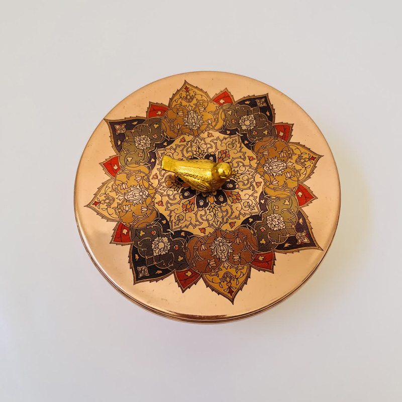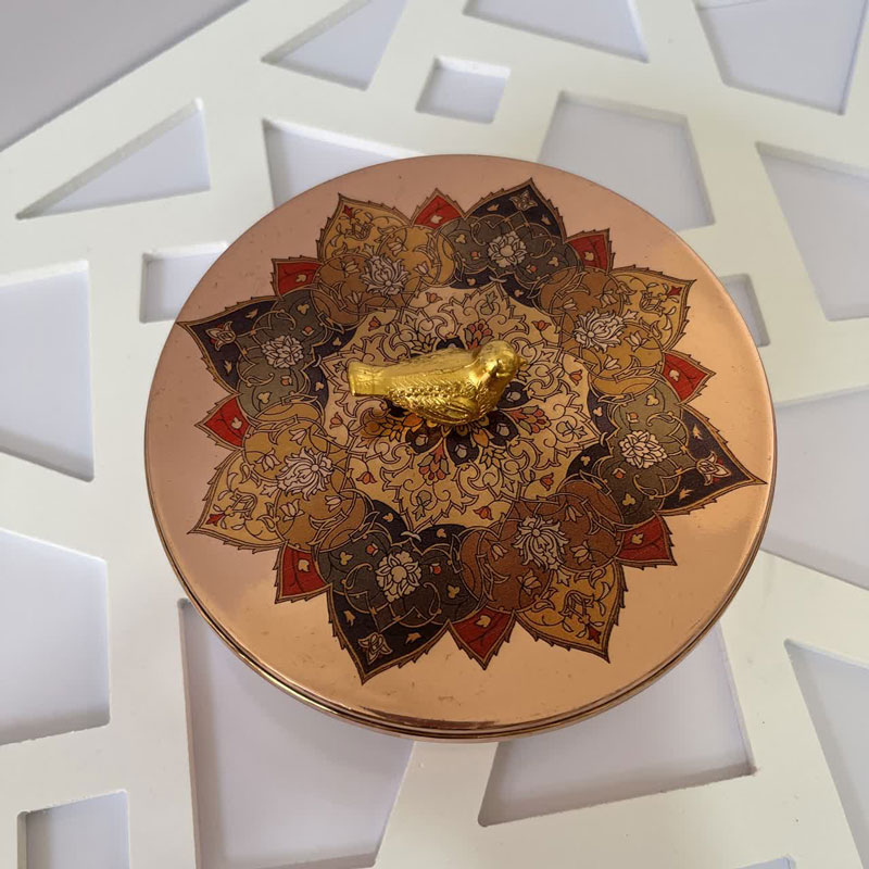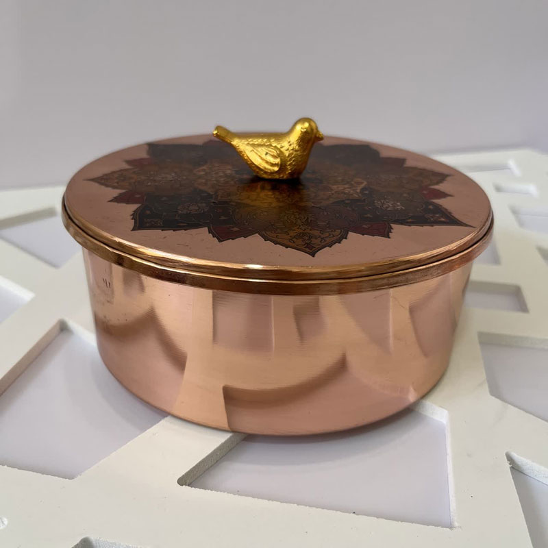 - **طراحی دوگانه:** ترکیب بدنه ساده مسی و درب کار شده، یک تعادل زیبا بین سادگی و تجمل ایجاد میکند.