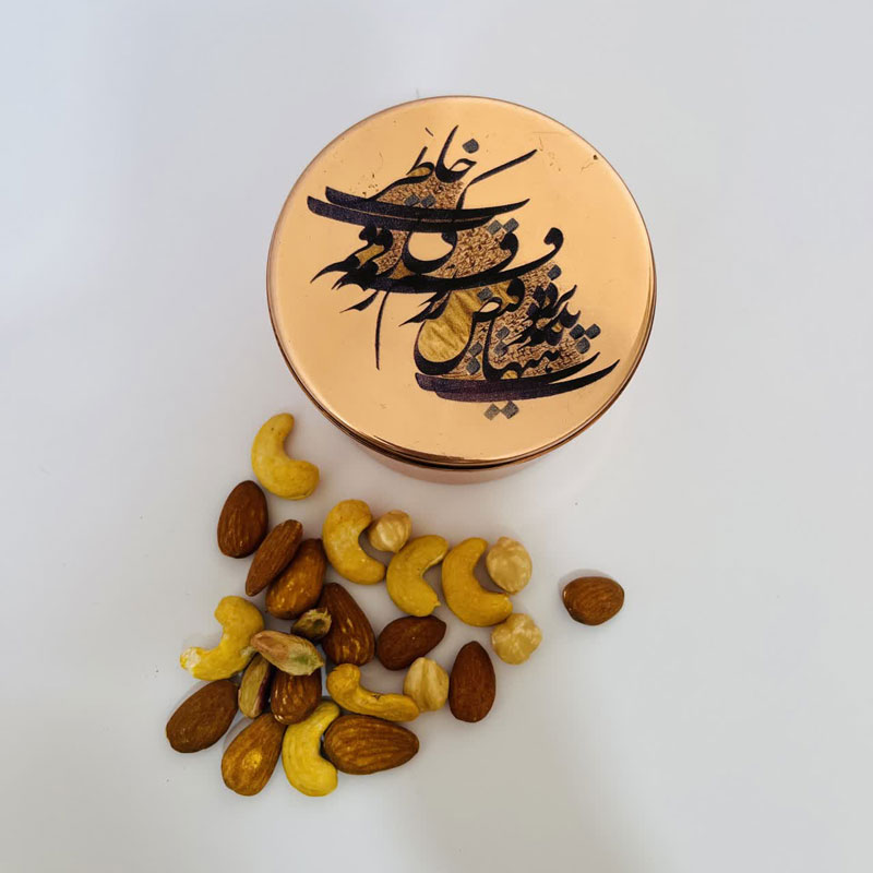 درب این شکلاتخوری، خود یک تابلوی هنری کوچک است. نگاره خوشنویسی به کار رفته، نماد غنای ادبی و ظرافت هنرهای تزئینی ایرانی است. ساختار استوانهای ظرف و درب تخت، باعث میشود نگاره به خوبی در دید باشد و به عنوان یک المان دکوری روی میز بدرخشد.