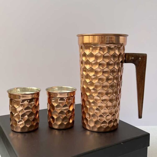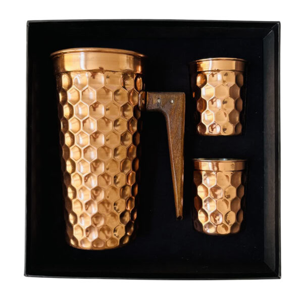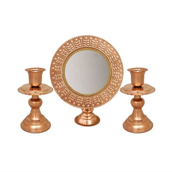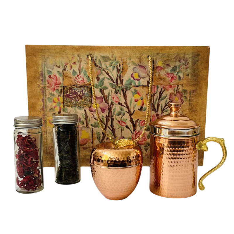 قوری مسی کوچک و دسته‌دار (با قابلیت استفاده به عنوان شیرجوش یا قوری دمنوش) با ظرافت **چکش‌کاری** ساخته شده است. این قوری دارای روکش داخلی استاندارد است. قندان مسی طرح سیب نیز با طراحی فانتزی و چشم‌نواز خود، تکمیل‌کننده بخش مسی این پک است و نمادی از زیبایی و سلامتی است.