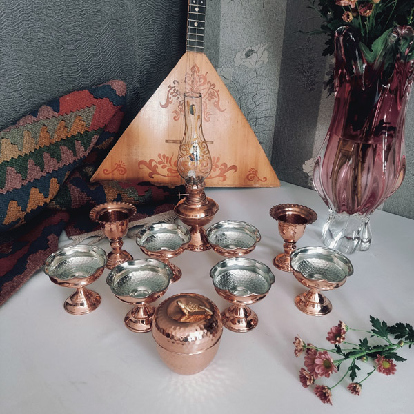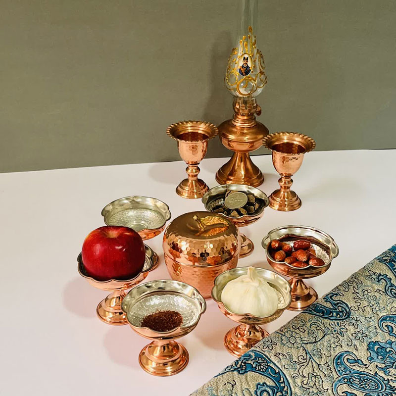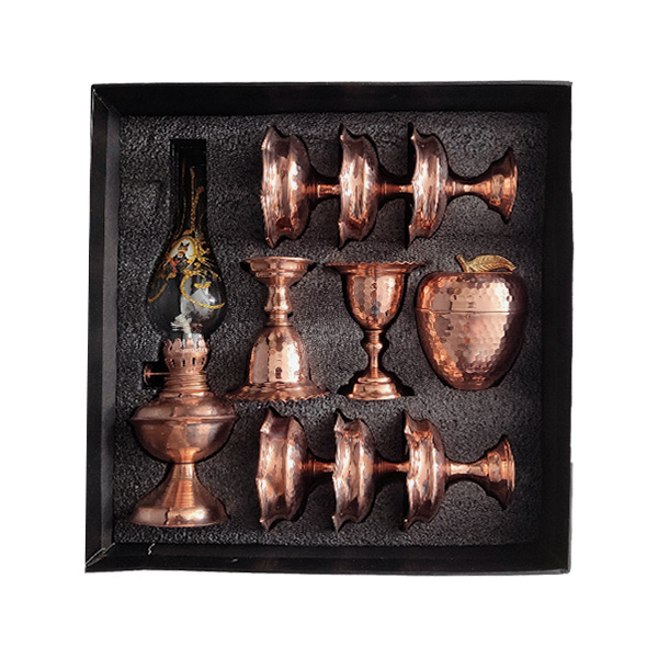 چراغ گردسوز مسی سنتی (نماد روشنایی، حرارت و گرمی زندگی) یک آیتم خاص و با ارزش است که این ست را از سایر ستهای ساده متمایز میکند. در کنار آن، **قندان مسی طرح سیب** به عنوان ظرف مرکزی سرو یا ظرفی برای سماق/سنجد عمل میکند.